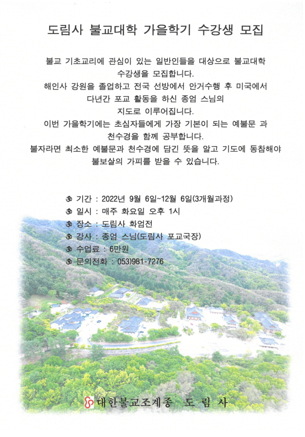 도림사 불교 대학 가을학기 수강생 모집!! 페이지 정보 작성자 가람지기 작성일22-03-21 17:08 조회3,143회 댓글0건 본문 . 댓글목록 등록된 댓글이 없습니다. 이전글 다음글 목록